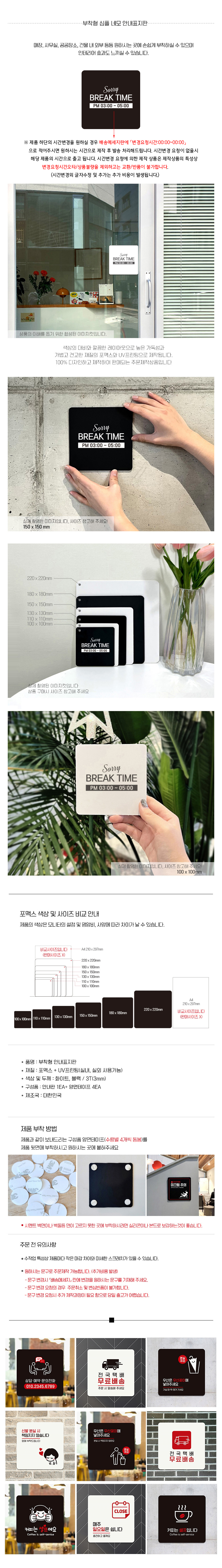 | 상품정보제공고시 | 품명: SORRY BREAK TIME 부착형 정사각 소형안내판 모델명: TS14120627 제조자(수입자): JJDECO 제조국: 대한민국 A/S 책임자와 전화번호: 상세페이지 참조 |