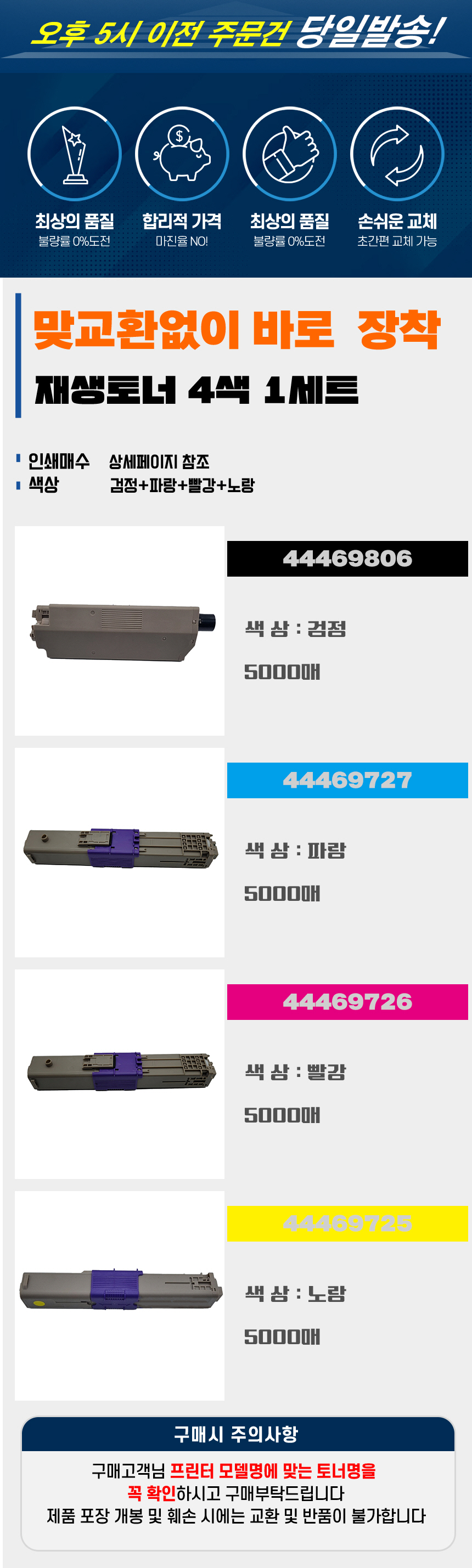 | 사용상 주의사항 | 제품을 교체,제거할 때 내용물의 누출에 주의하십시오. 내용물 누출시 분진,미스트,증기의 흡입 또는 피부 접촉에 주의하십시오. 가정용 진공청소기로 토너를 청소하지 말고, 젖은 천으로 닦아내십시오. |