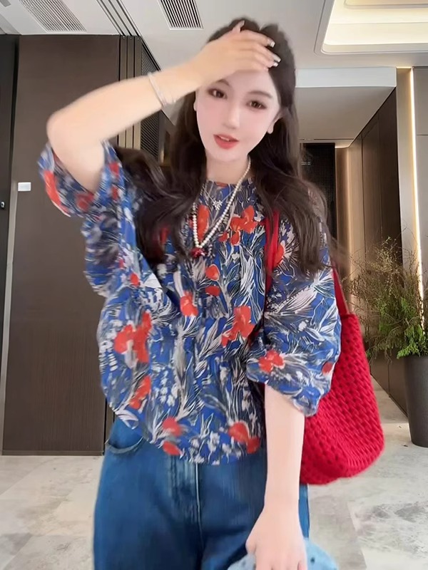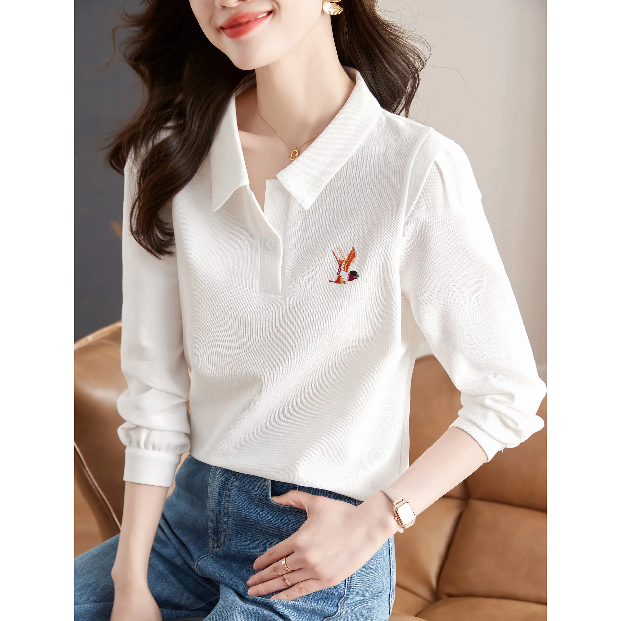 2026 신상 황학루 자수 레이스 쉬폰 블라우스, 오픈카라 우아함
