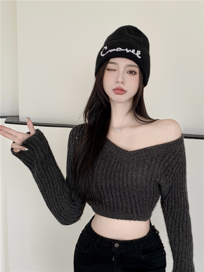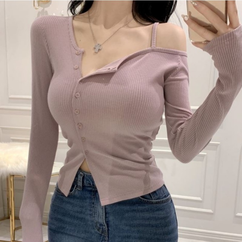 동대문 디자인 슬림 오프숄더 골지 니트 티 - 섹시핏 여성용
