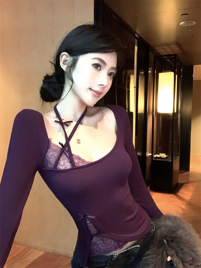 실물특가! 25SS 레이스 배색 홀터넥 허리라인 슬림핏 긴팔티