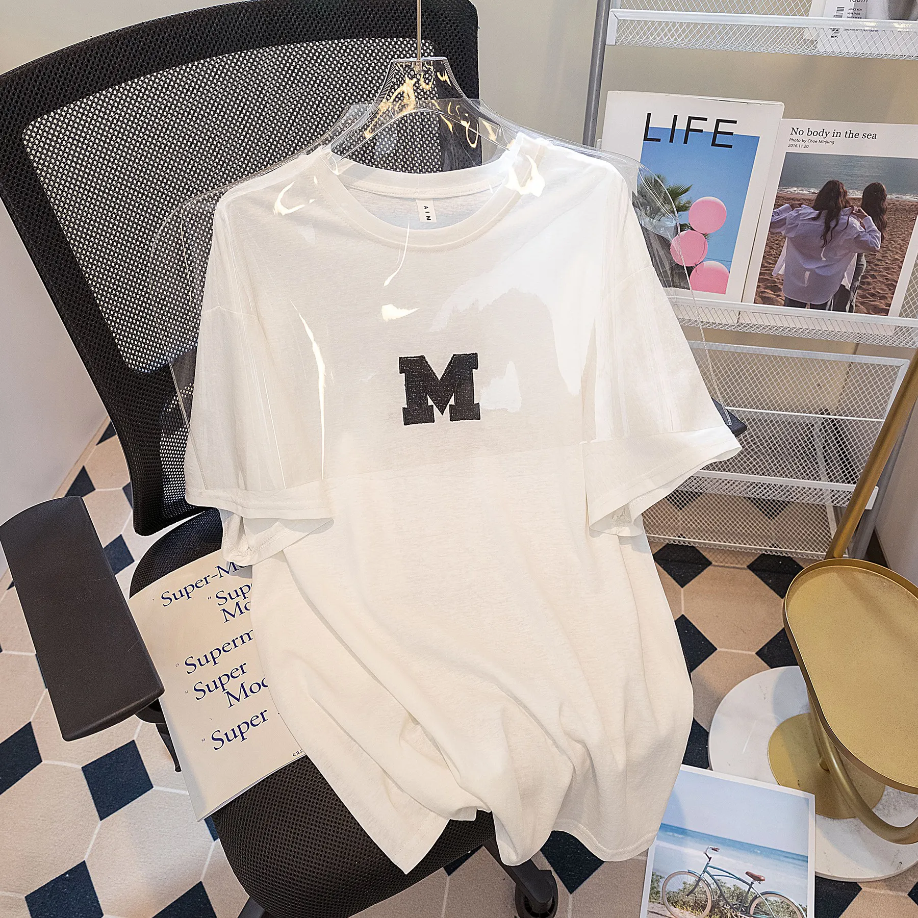 주문폭주 복고 홍콩풍 라운드 배색 프린트 여성 데일리 감성 티셔츠
