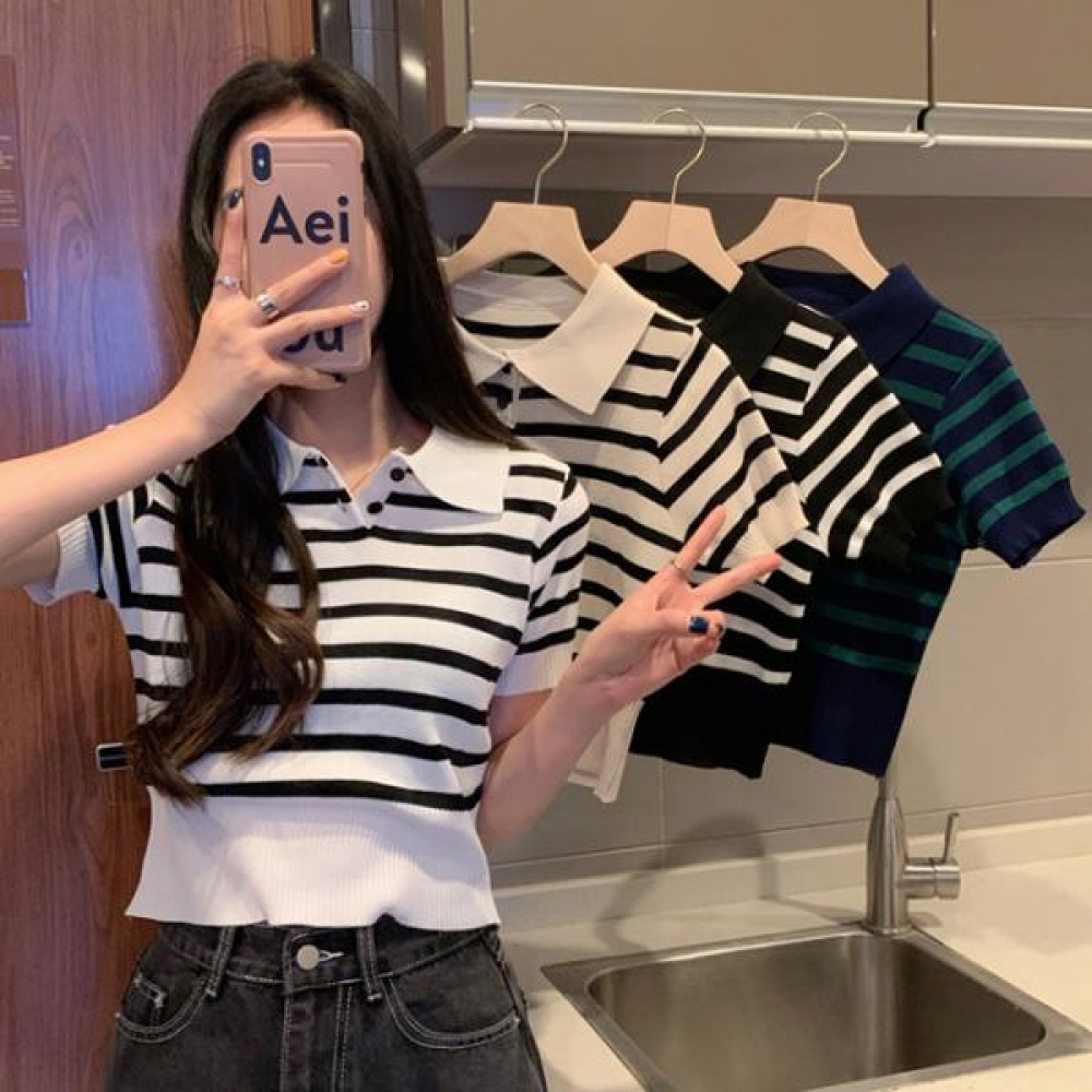 스트라이프 카라 여름 반팔 니트 HH-E52