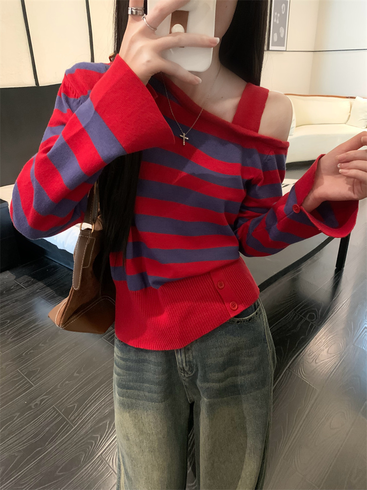 가을 신상 스트라이프 오프숄더 슬림 니트웨어