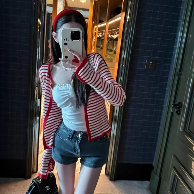 봄신상 티티 여성 레트로 라운드 배색 스트라이프 니트 가디건