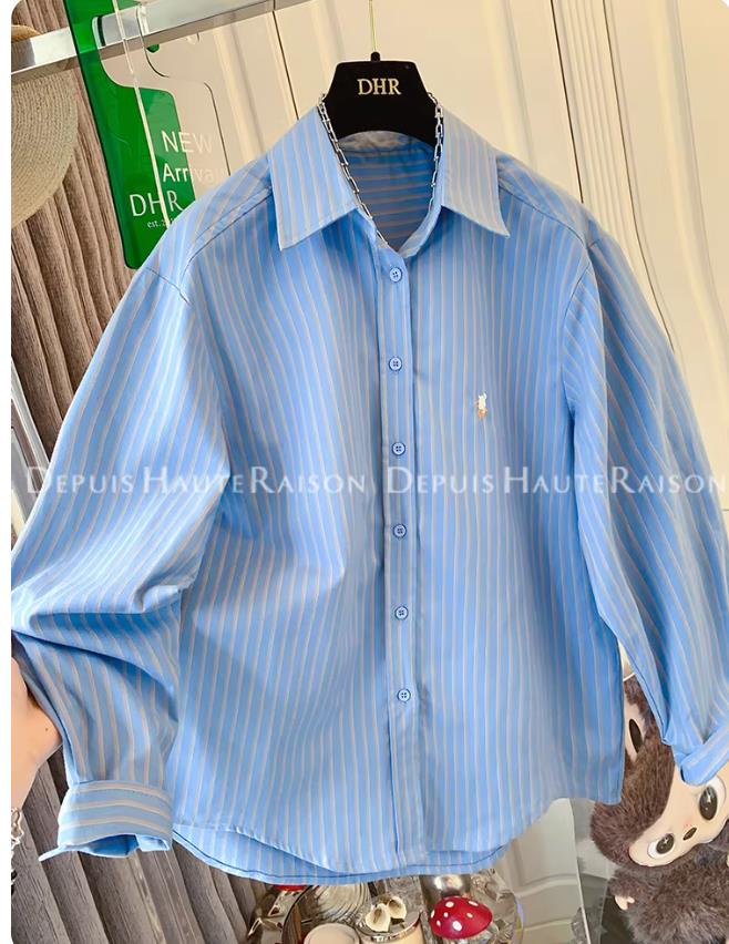 2026 신상 고급스러운 블루 스트라이프 기모 셔츠(루즈핏)